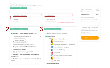 1) Выбрать ваш город, указать адрес, по которому необходимо будет доставить ваш заказ (при курьерской доставке), указать контактный телефон и e-mai.